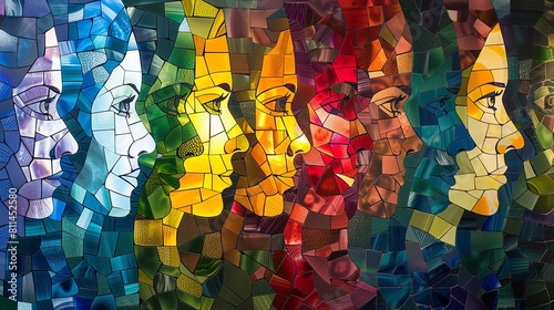 A mosaic of faces in different colors and sizes, each representing one woman's face. The background is a vibrant rainbow with soft lighting that casts gentle shadows on the glass pieces. This design s
