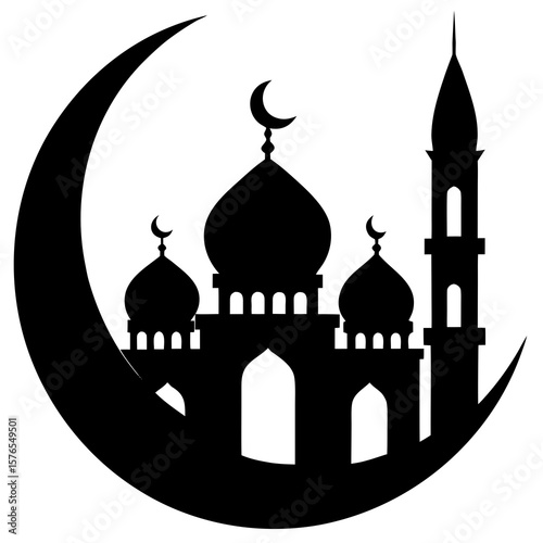 A mosque silhouette set against a large crescent moon