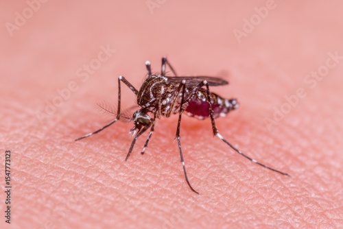 a mosquito on a human arm, sucking blood, extreme close-up,