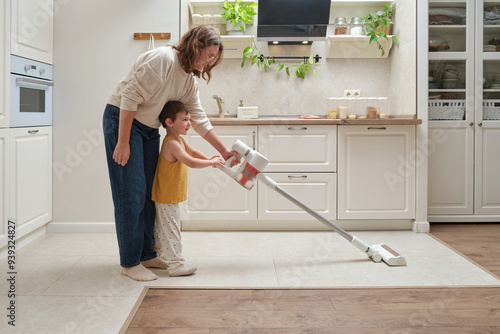 A mother and child are vacuuming the floor with a vacuum cleaner in the kitchen. Mom and son with a portable vacuum cleaner are cleaning the house. Kid aged three years (three-year-old boy)
