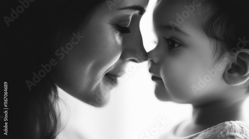 A mother and daughter share an intimate moment, gently touching noses while gazing at each other in a serene indoor setting