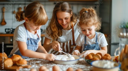 A mother and her children making breakfast together in the kitchen on Mother's Day They are smiling and chatting as they cook and the kitchen is filled with delicious aromas