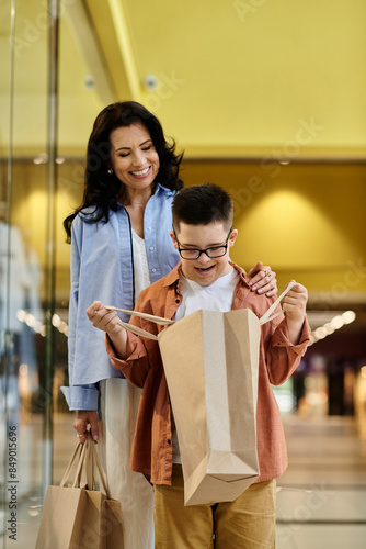 A mother and her son with Down syndrome are walking through a shopping mall, enjoying a day of shopping and bonding.