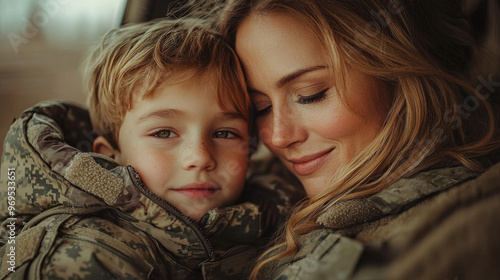 A mother and son share a tender moment, her eyes closed in peace, his full of wonder.