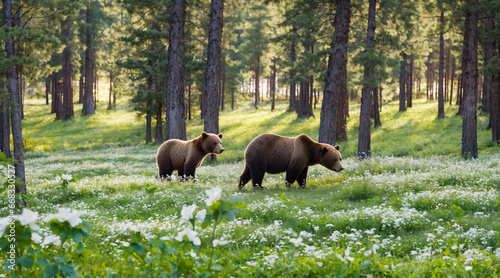A mother bear and a bear cub are walking through the forest. Generative AI