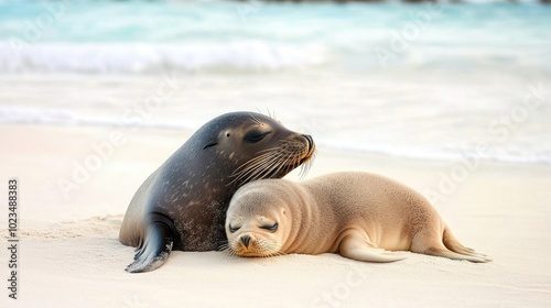 A mother seal and her pup cuddled together on a sandy beach, creating a heartwarming scene of marine wildlife.