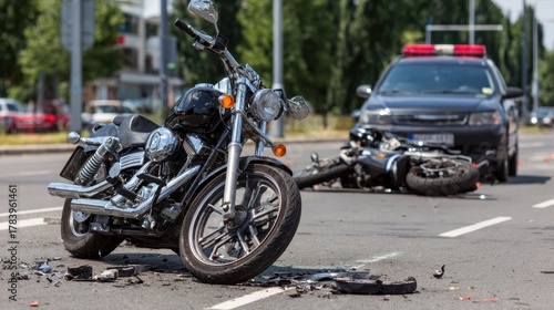 A motorcycle lays on its side on a city road, surrounded by debris. A police car is parked nearby, and emergency responders are assessing the situation.