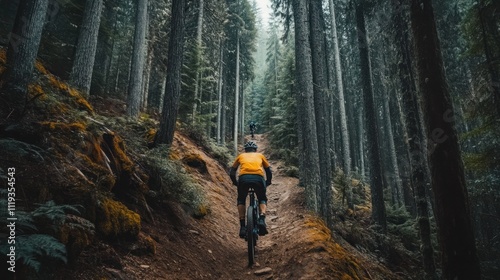 A mountain biker navigating a rugged trail through a dense forest, with trees towering on either side