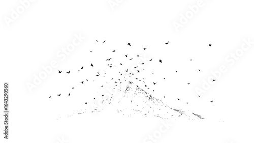 A mountain peak with a flock of birds flying around it in a monochromatic black and white illustration style