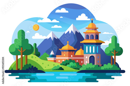 A Mountainous Landscape With A Grand Building And A Lake