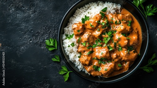 A mouthwatering bowl of chicken in creamy sauce served with fluffy white rice, garnished with fresh parsley, perfect for showcasing comfort food and culinary delights.