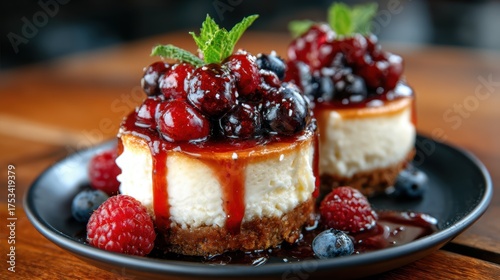 A mouthwatering cheesecake topped with a variety of fresh berries, drizzled with berry sauce, and decorated with mint leaves, embodying the essence of sweet indulgence and delight.