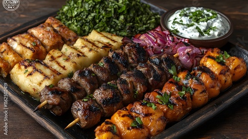 A Mouthwatering Display of Various Grilled Kebabs with Juicy Meats, Colorful Vegetables, and Fresh Herbs on a Rustic Wooden Table