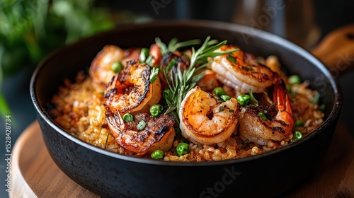 A mouthwatering shrimp dish featuring perfectly grilled shrimp on a bed of seasoned rice, garnished with fresh herbs and green peas, making it an appealing meal.