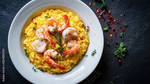 A mouthwatering top-down view of saffron-infused risotto, elegantly garnished with seafood and herbs, served in a white bowl on a dark slate surface, creating a striking visual contrast.