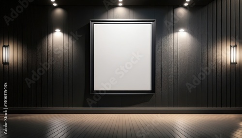 A movie poster mockup framed and hanging in a dimly lit, stylish gallery interior, creating an artistic and refined atmosphere, ideal for showcasing cinematic design and film promotions.