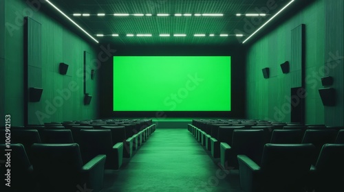 A movie theater screen with a green screen, rows of empty dark leather seats, and a minimalist interior design