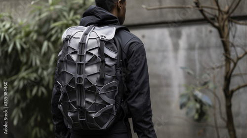 A multifunctional backpack with 3D printed ss and compartments perfect for urban exploration or a hike through a lush forest.