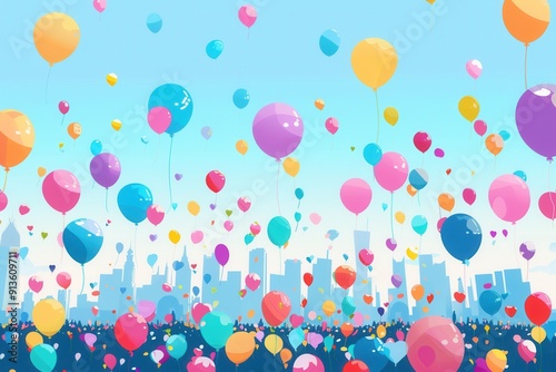 A multitude of balloons floats above crowds enjoying the lively atmosphere of a festive city fair under a bright blue sky. Generative AI
