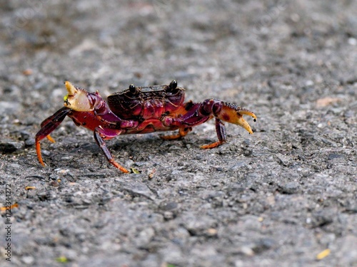 A Muong Mai Tong crab predominantly purple and red walking on a ground at Kaeng Krachan Petchburi Thailand
