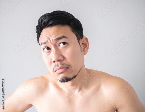 A muscular man with a confident expression stands shirtless, gazing directly at the camera against a blurred outdoor background, showcasing his toned physique.