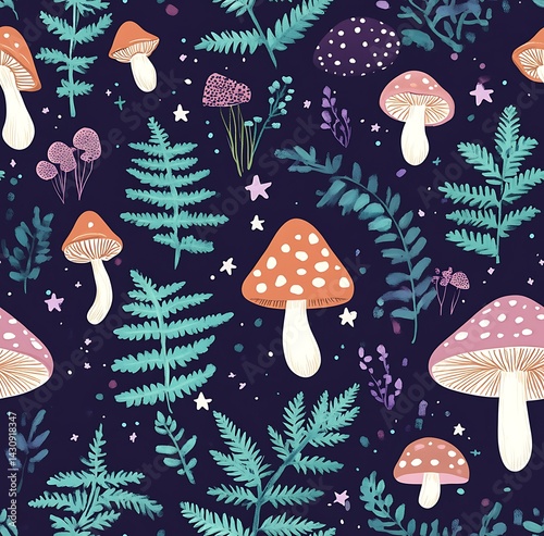 A mushroom, star, and fern seamless pattern in dark purple with teal and pink accents