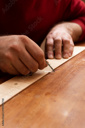 A musical instrument maker peels off a thin layer of guitar neck using glass