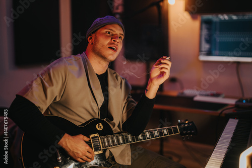 A musician performs on a guitar while sitting in a recording studio. The setting is cozy, showcasing his dedication and inspiration during the creative process.