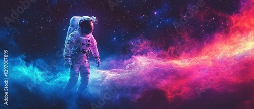 A Mysterious Astronaut in a Colorful Cosmic Nebula: Exploring the Depths of Space with Vivid Blue and Red Gases Surrounding Him