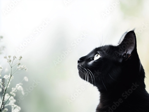 A Mysterious Black Cat Gracefully Rests Against a Bright White Backdrop, Showcasing Its Glossy Fur and Piercing Eyes in a Striking Display of Beauty and Intrigue.