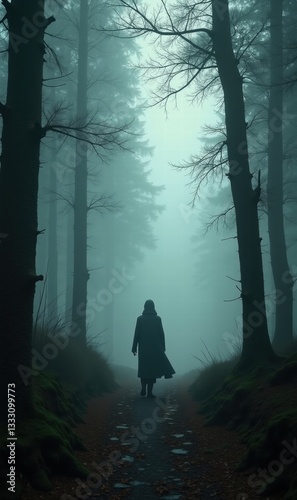 A mysterious figure in a foggy forest, creating an atmosphere of intrigue and suspense, perfect for storytelling, horror themes, or creative projects.