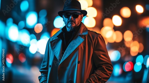 A mysterious figure in a trench coat and hat stands against a vibrant city backdrop.