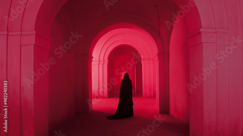 A mysterious figure in dark robes stands at the entrance of an ancient, pink-hued room with arched doorways
