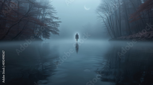 A mysterious figure stands in the misty forest, silhouetted against a crescent moon, reflecting in a still lake at dawn.