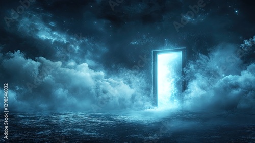 A mysterious glowing door slightly ajar, revealing a bright ethereal light beyond, inviting curiosity.