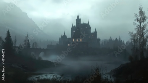 A mysterious, medieval castle stands tall on a foggy hill, illuminated by soft, warm light.