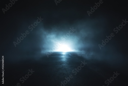 A mysterious road fades into light through swirling smoke