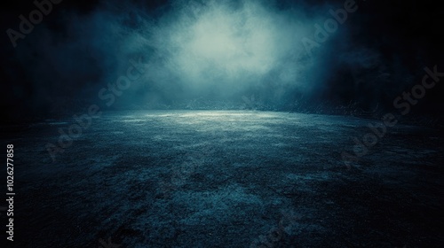 A mysterious scene of an empty stage glowing under a white spotlight with light smoke drifting across, suggesting an imminent and thrilling show.