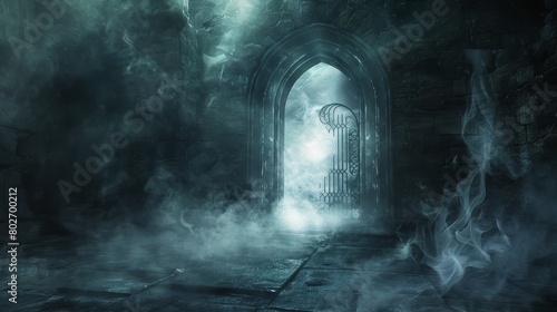 A mysterious scene with light shining from an opened door set in a dungeon, surrounded by hellish smoke and a ring gate, eerie mist and cobwebs