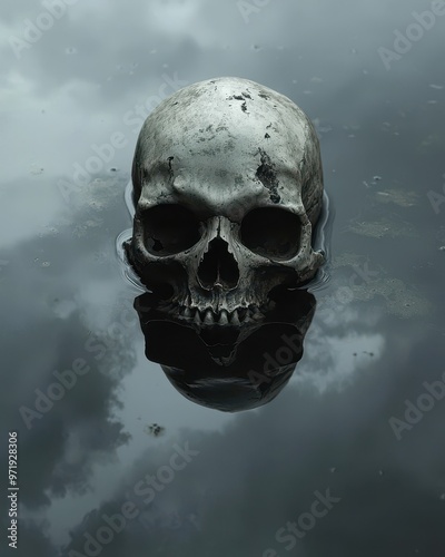 A mysterious skull floats in dark water, surrounded by ominous clouds.