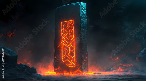 A mysterious stone monolith covered in glowing runes stands tall. Ancient Glowing Monoliths. Illustration