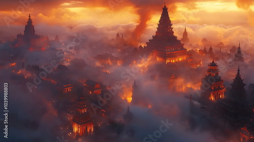 A mystical blaze fiery temples emerge from the mist at dusk unveiling an enigmatic world of flames and shadows