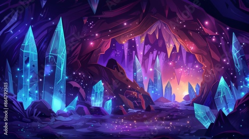 A mystical, colorful crystal cave with glowing, vibrant crystals and sparkling lights, creating a magical, fantasy-like atmosphere.