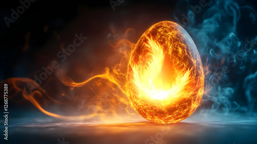 A mystical egg igniting with fiery energy and surrounded by swirling smoke.