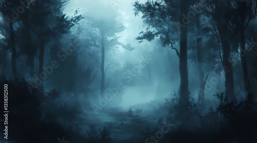 A mystical forest shrouded in dark mist, evoking a sense of enchantment and mystery at twilight. Shrouded Depth. Illustration