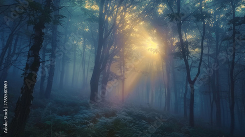 A mystical forest shrouded in fog with sun rays piercing through the canopy above and illuminating the undergrowth.