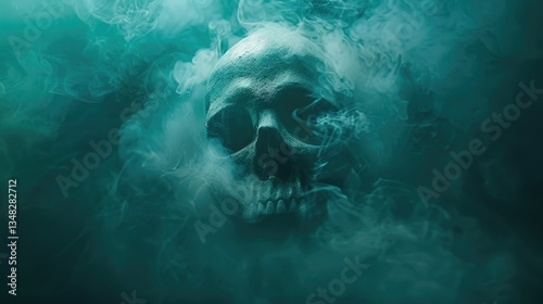 A mystical skull surrounded by thick fog in a dark, enchanted world, evoking gothic horror and ancient mystical rituals.