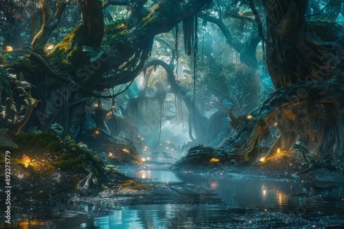 A mystical swamp, with ancient, gnarled trees, and mist swirling around the ground
