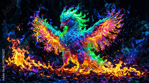 a mythical phoenix bird rising from the ashes. Stunning, detailed face of Phoenix bird is made of glowing, iridescent feathers made of flames of the colours of orange, purple, blue, green colours