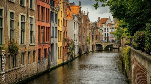 A narrow canal in a European city, lined with colorful historic buildings and stone bridges.